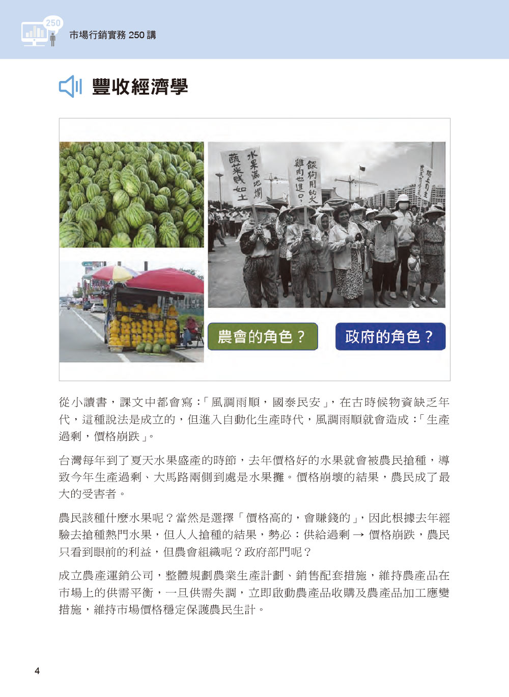 Unit-1 不可不知的經濟學Unit-2 消費者需求Unit-3 行銷概論Unit-4 Price價格:定價策略與消費者定位Unit-5 Product產品:產品研發、設計、組合對市場的影響Unit-6 Place通路:通路選擇、通路轉移對市場的影響Unit-7 Promotion促銷:促銷活動、策略個案探討Unit-8 國際行銷:全球化企業的個案探討Unit-9 行銷個案:成功行銷個案剖析