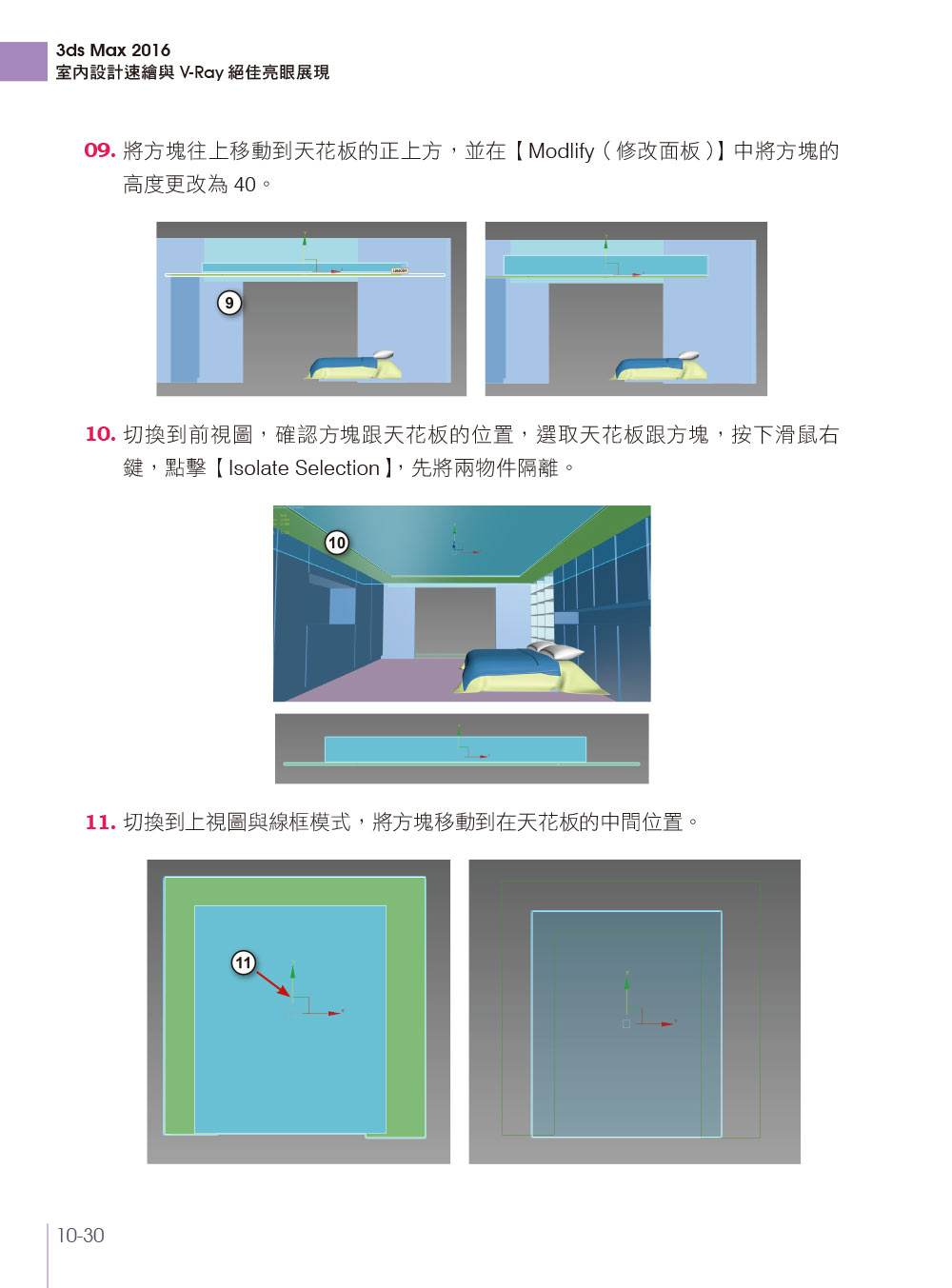 01 3ds Max 介面和基本操作先熟悉3ds Max如何設定面板、各介面的用途,以及基本操作與繪製簡易模型,並使用3ds Max現有基本模型繪製出家具,讓第一次使用的初學者快速入門與熟悉操作方式。02 室內建模常用工具介紹3ds Max擁有各種不同功能修改器,對已經製作完成的模型進行修改變形,是快速建模的好幫手,本章將使用多種修改器一步步繪製出第一個場景建模。03 多邊形建模工具介紹3ds Max的特色是可將建立出的模型轉換為可塑型的多邊形模型,幾乎所有複雜的模型,皆可使用Poly的擠出、倒角、焊接⋯等功能建立出來,是一個強大的塑型工具,本章將使用簡單範例介紹常用Poly功能。04 V-Ray 材質主要介紹V-Ray材質的各種基礎設定,例如:反射、折射、菲涅爾⋯等。透過各種參數的配合,使材質表現出磁磚、木地板⋯等各種物體表面的素材質感。05 V-Ray 燈光設定與調整V-Ray主要有V-Ray Light、IES、V-Ray Sun⋯等燈光與特殊光材質,功能為照亮場景或讓物體發光,熟悉各種燈光的特性,可在不同情況下使用不同燈光表現出所希望的氣氛。06 V-Ray 彩現設定 透過設定不同的彩現設定參數,使測試渲染效果時的速度能夠加快,渲染最終效果圖時,能渲染出高畫質、高清晰度的效果圖,本章有測試版與最終彩現版的完整參數介紹。07 和室房建立一個簡約風格的和室,帶領讀者從無到有完成一個範例,並使用環境光與間接照明來營造和室氣氛。08 日式浴室建立日式大浴室,介紹金屬、水、玻璃⋯等材質,以及包裹與替代⋯等特殊材質,再利用V-Ray陽光作渲染,是一個有著多重技巧的範例場景練習。09 客廳空間設計學習如何由AutoCAD平面圖來建立一個客廳場景,介紹皮革、地毯、V-Ray光材質⋯等家具常用材質,並利用線框材質與軟體後製出漸變效果圖。10 現代風格臥室設計將使用前幾章所介紹的材質與燈光類型,渲染一個現代風格臥室,並利用V-Ray light的不同類型光源,來營造臥室氣氛。(此章為PDF格式電子書,請見書附光碟)11 咖啡廳的室內空間表現本章節將渲染咖啡廳室內空間,介紹窗簾、沙發椅等材質與菲涅爾技巧,並介紹如何製作拼貼地磚,最後使用IES燈作渲染,完成咖啡廳的空間表現。(此章為PDF格式電子書,請見書附光碟)12 咖啡廣場建築室外表現建立一個咖啡廣場,學習如何渲染室外建築場景、使用V-Ray代理器替代複雜模型,並設置V-Ray物理相機,渲染景深特效。可利用本書技巧加以應用,創作出各種不同風格氣氛的室內與建築場景!(此章為PDF格式電子書,請見書附光碟)