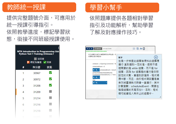 管理功能特色: 可從題庫自製特定功能的目標評量 為教師提供線上管理後台與評測追蹤工具 為學生提供線上模組建立學習成效評量 學生帳戶管理功能 學生探索與學習各類別能力之常態性具體學習模式 學生可按自我步調學習