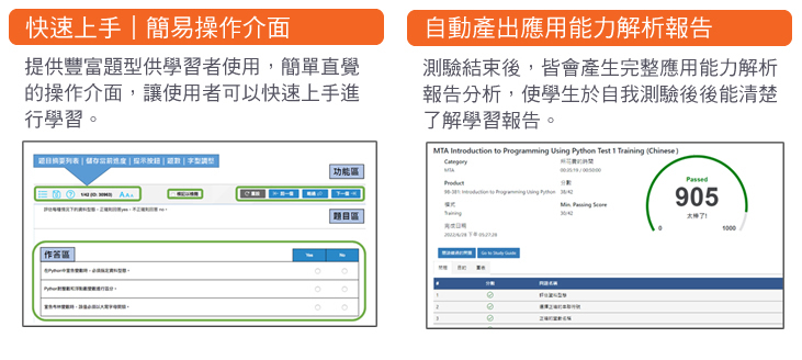 評量系統特色: 完美模擬國際認證考試環境 透過自訂題型模組以增強學習力 學評規劃對應國際認證考試項目 高效能的學評系統模組 評測内容模擬實際職場應用 自訂學習與評量進度 自動產出應用能力解析報告 評量內容符合各原廠學習教材