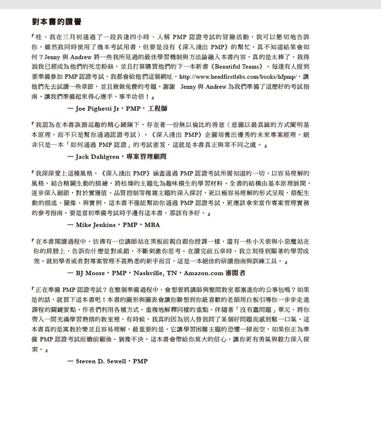 涵蓋《PMBOK Guide》第五版2016 PMP 更新版通過 PMP 認證考試的學習良伴把通過認證考試所需的概念深植到你的腦海運用風險管理避免令人困窘的專案問題利用數百個實務問題焠鍊你的 PMP 知識你將從本書學到什麼?《深入淺出PMP》以活潑生動的手法完整涵蓋《PMBOK Guide》(專案管理知識體系指南)的內容,絕無一絲照本宣科、冗長無趣的酸腐味。本書以獨特的方式幫助你準備PMP認證考試,超越一般制式的問題與解答,引導你深入思考專案管理的完整脈絡,透過將專案管理的觀念引進真實的情境,你將能夠充分理解、記憶、與應用 — 不只在考試中,更在實務工作上,所以才會有那麼多人將《深入淺出PMP》當作是通過PMP認證考試的葵花寶典。這本書為何如此與眾不同?根據神經生物學、認知科學、與學習理論,《深入淺出 PMP》採取專為大腦運作而設計的豐富視覺化風格,而不是讓你昏昏欲睡的文字敘述。『我在專案管理公司教導專案管理,並且選用《深入淺出 PMP》作為我的專用教材,我的學生當中有 84% 的人一次就成功通過 PMP 與 CAPM 認證考試,可謂成績斐然。對於任何想要改善專案管理技巧並且通過 PMP 認證的人來說,這本書堪稱目前為止寫得最好、內容最完整的一本書。』— Rocket Williams,PMP,MCITP,MCT『我從事專案管理工作超過 30 年的時間, 並且被推崇為《PMBOK Guide》的主題專家…我可以懇切地告訴你,《深入淺出 PMP》是目前為止我所審閱過的最佳 PMP 考試用書,是我所讀過有關專案管理基礎的最佳教育訓練書籍…這是一項準備 PMP 考試的神兵利器。』— Dennis Bolles,PMP,《The Power of Enterprise-Wide Project Management》的共同作者