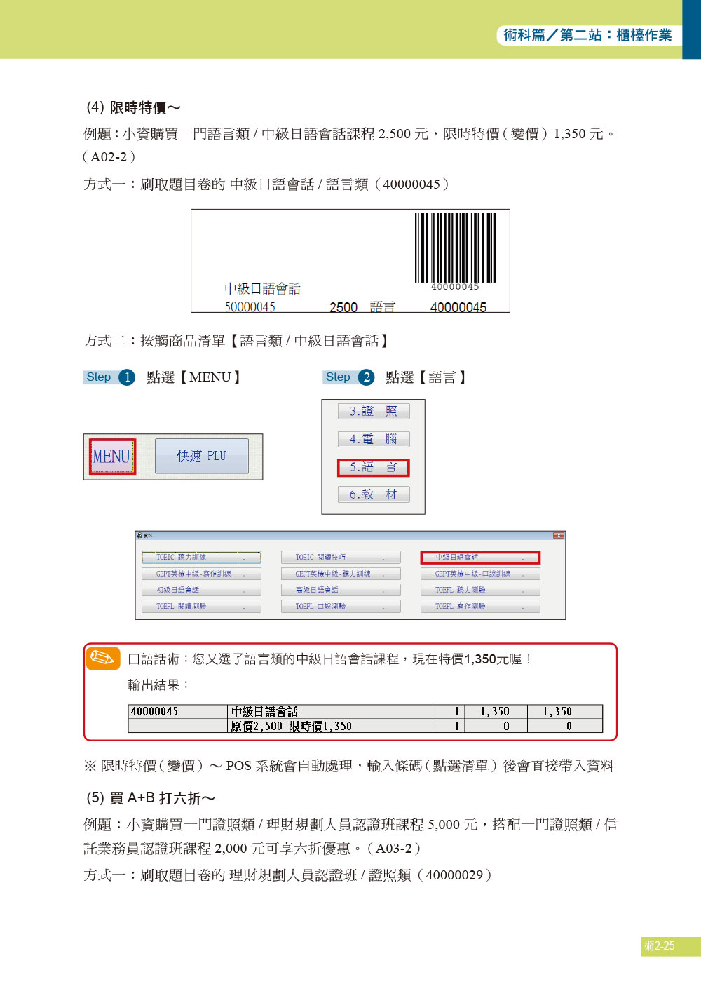 應檢人須知【學科篇】工作項目 01 零售概論工作項目 02 門市行政工作項目 03 門市清潔工作項目 04 商品處理作業工作項目 05 櫃檯作業工作項目 06 顧客服務作業工作項目 07 簡易設備操作工作項目 08 環境及安全衛生作業工作項目 09 職業道德【術科篇】第一站:筆試 第一題型:門市管理作業 第二題型:櫃檯管理作業 Part I:三聯式手開式統一發票 Part II:免用統一發票收據 Part III:收銀機統一發票 Part IV:鈔票辨識圖示說明題 第三題型:清潔管理作業 第四題型:門市管理作業 第五題型:POS 相關帳表第二站:櫃檯作業 櫃檯作業答案卷 測試評審表 櫃檯類型試題說明 準備作業 考試開始 簡易設備操作 結帳作業-文教服務類整合10大招 -零售服務類整合10大招 -餐飲服務類整合10大招 -統整篇 -狀況四怪 投庫作業 離櫃作業 櫃檯作業試題 櫃檯類型<文教服務類>A01-12 櫃檯類型<零售服務類>B01-12 櫃檯類型<餐飲服務類>C01-12第三站:清潔作業 (一)地板清潔 (二)玻璃清潔