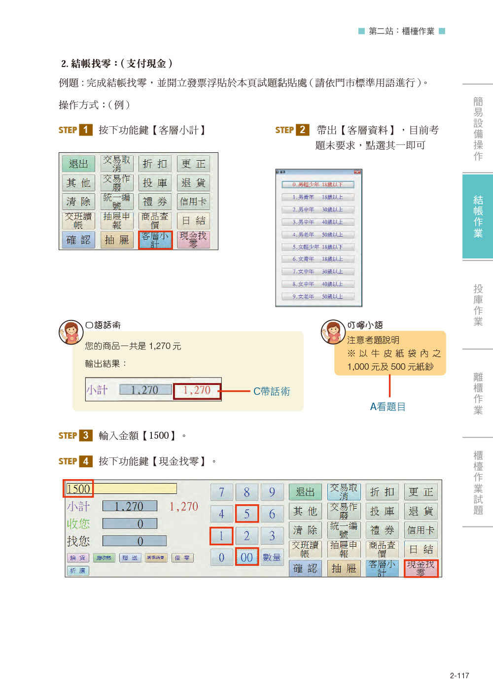 【學科篇】工作項目 01 零售概論工作項目 02 門市行政工作項目 03 門市清潔工作項目 04 商品處理作業工作項目 05 櫃檯作業工作項目 06 顧客服務作業工作項目 07 簡易設備操作90006 職業安全衛生共同科目90007 工作倫理與職業道德共同科目【術科篇】第一站:筆試 第一題型:門市管理作業 第二題型:櫃檯管理作業 Part I:三聯式手開式統一發票 Part II:免用統一發票收據 Part III:收銀機統一發票 Part IV:鈔票辨識圖示說明題 第三題型:清潔管理作業 第四題型:門市管理作業 第五題型:POS 相關帳表第二站:櫃檯作業 櫃檯作業答案卷 測試評審表 櫃檯類型試題說明 準備作業 考試開始 簡易設備操作 結帳作業-文教服務類整合10大招 -零售服務類整合10大招 -餐飲服務類整合10大招 -統整篇 -狀況四怪 投庫作業 離櫃作業 櫃檯作業試題<文教服務類>A01-12/<零售服務類>B01-12/<餐飲服務類>C01-12第三站:清潔作業 (一)地板清潔 (二)玻璃清潔附錄:應檢人須知