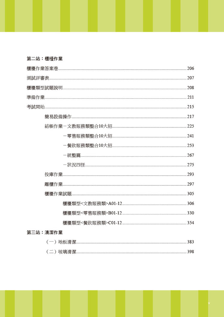 應檢人須知【學科篇】工作項目 01 零售概論工作項目 02 門市行政工作項目 03 門市清潔工作項目 04 商品處理作業工作項目 05 櫃檯作業工作項目 06 顧客服務作業工作項目 07 簡易設備操作工作項目 08 環境及安全衛生作業工作項目 09 職業道德【術科篇】第一站:筆試 第一題型:門市管理作業 第二題型:櫃檯管理作業 Part I:三聯式手開式統一發票 Part II:免用統一發票收據 Part III:收銀機統一發票 Part IV:鈔票辨識圖示說明題 第三題型:清潔管理作業 第四題型:門市管理作業 第五題型:POS 相關帳表第二站:櫃檯作業 櫃檯作業答案卷 測試評審表 櫃檯類型試題說明 準備作業 考試開始 簡易設備操作 結帳作業-文教服務類整合10大招 -零售服務類整合10大招 -餐飲服務類整合10大招 -統整篇 -狀況四怪 投庫作業 離櫃作業 櫃檯作業試題 櫃檯類型<文教服務類>A01-12 櫃檯類型<零售服務類>B01-12 櫃檯類型<餐飲服務類>C01-12第三站:清潔作業 (一)地板清潔 (二)玻璃清潔