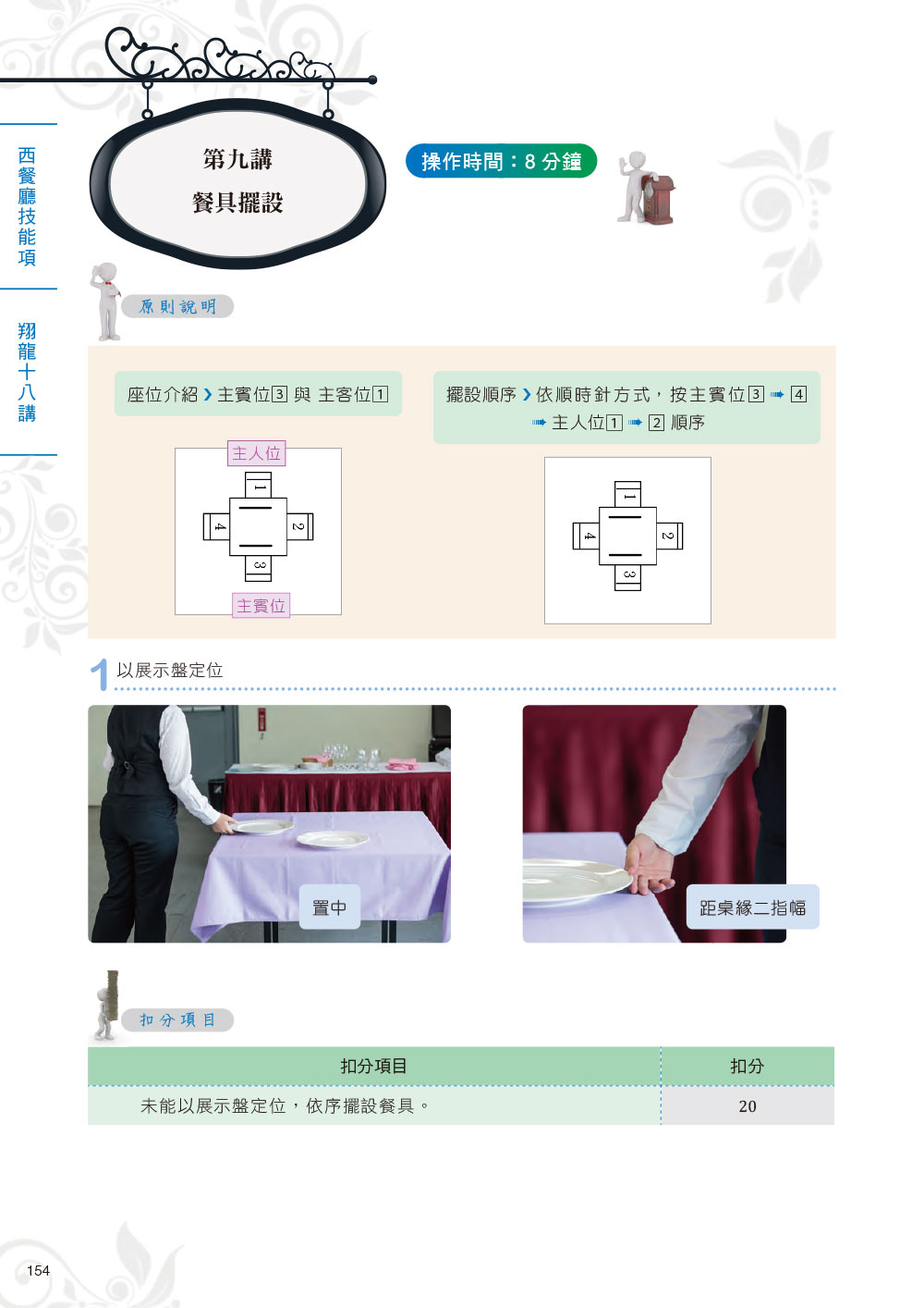 前言服儀檢查餐具備用篇術科篇中餐廳技能項翔龍18講:前置作業/中式餐桌擺設/服務流程/備品復歸勇士上戰場:前置作業/中式餐桌擺設/服務流程/備品復歸西餐廳技能項翔龍18講:服務檯布置/前置作業/西式餐桌擺設/服務流程/備品復歸勇士上戰場:服務檯布置/前置作業/西式餐桌擺設/服務流程/備品復歸學科篇工作項目 01:餐廳器具認識與餐桌擺設工作項目 02:基礎服勤方式工作項目 03:餐飲概論工作項目 04:餐飲安全與環保衛生工作項目 06:相關法規90006 職業安全衛生共同科目90007 工作倫理與職業道德共同科目附錄餐飲服務丙級技術士技能檢定術科測試應檢參考資料