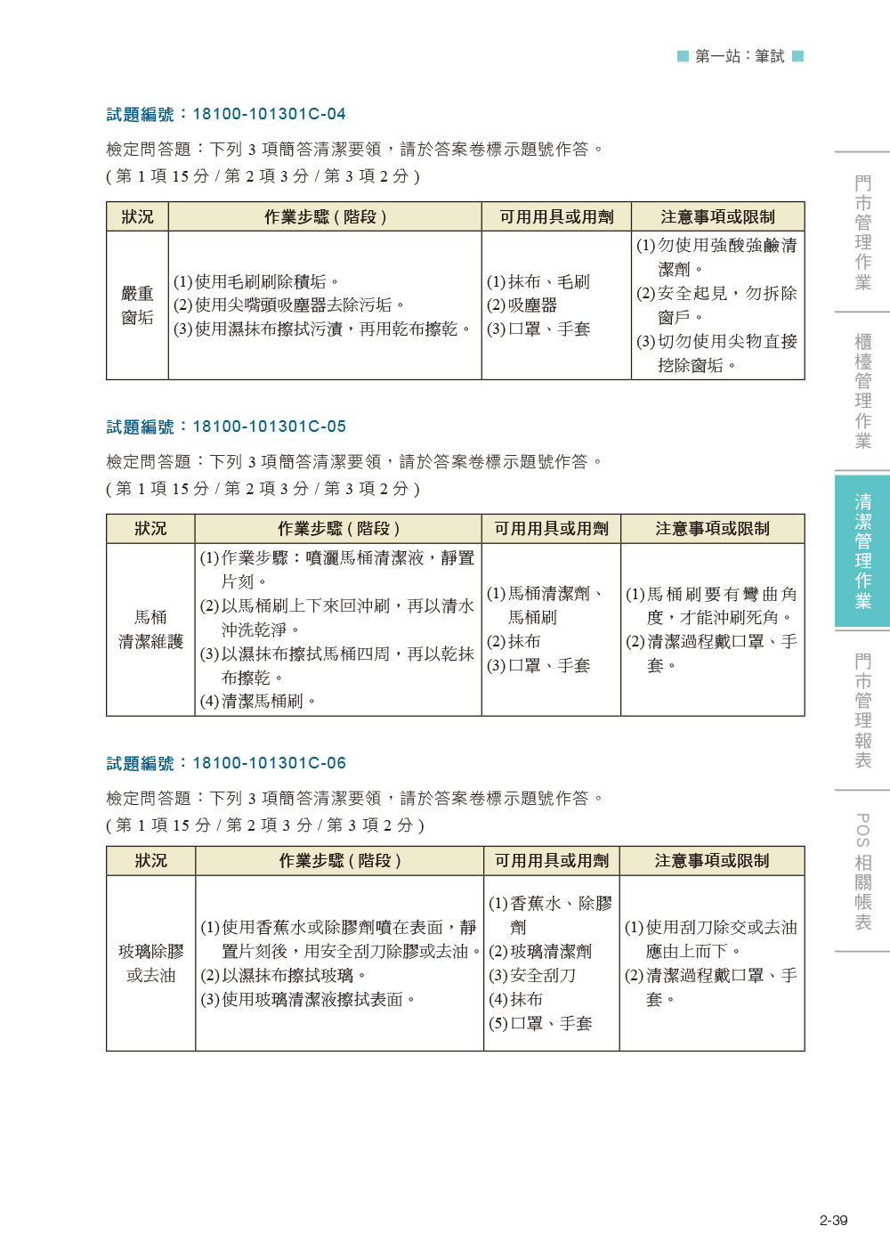 【學科篇】工作項目 01 零售概論工作項目 02 門市行政工作項目 03 門市清潔工作項目 04 商品處理作業工作項目 05 櫃檯作業工作項目 06 顧客服務作業工作項目 07 簡易設備操作90006 職業安全衛生共同科目90007 工作倫理與職業道德共同科目90008 環境保護共同科目90009 節能減碳共同科目【術科篇】第一站:筆試 第一題型:門市管理作業 第二題型:櫃檯管理作業 Part I:三聯式手開式統一發票 Part II:免用統一發票收據 Part III:收銀機統一發票 Part IV:鈔票辨識圖示說明題 第三題型:清潔管理作業 第四題型:門市管理作業 第五題型:POS 相關帳表