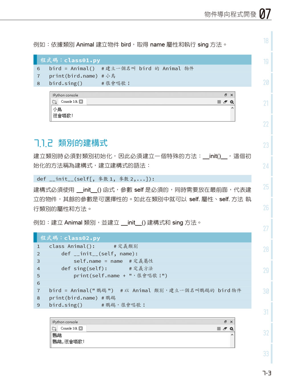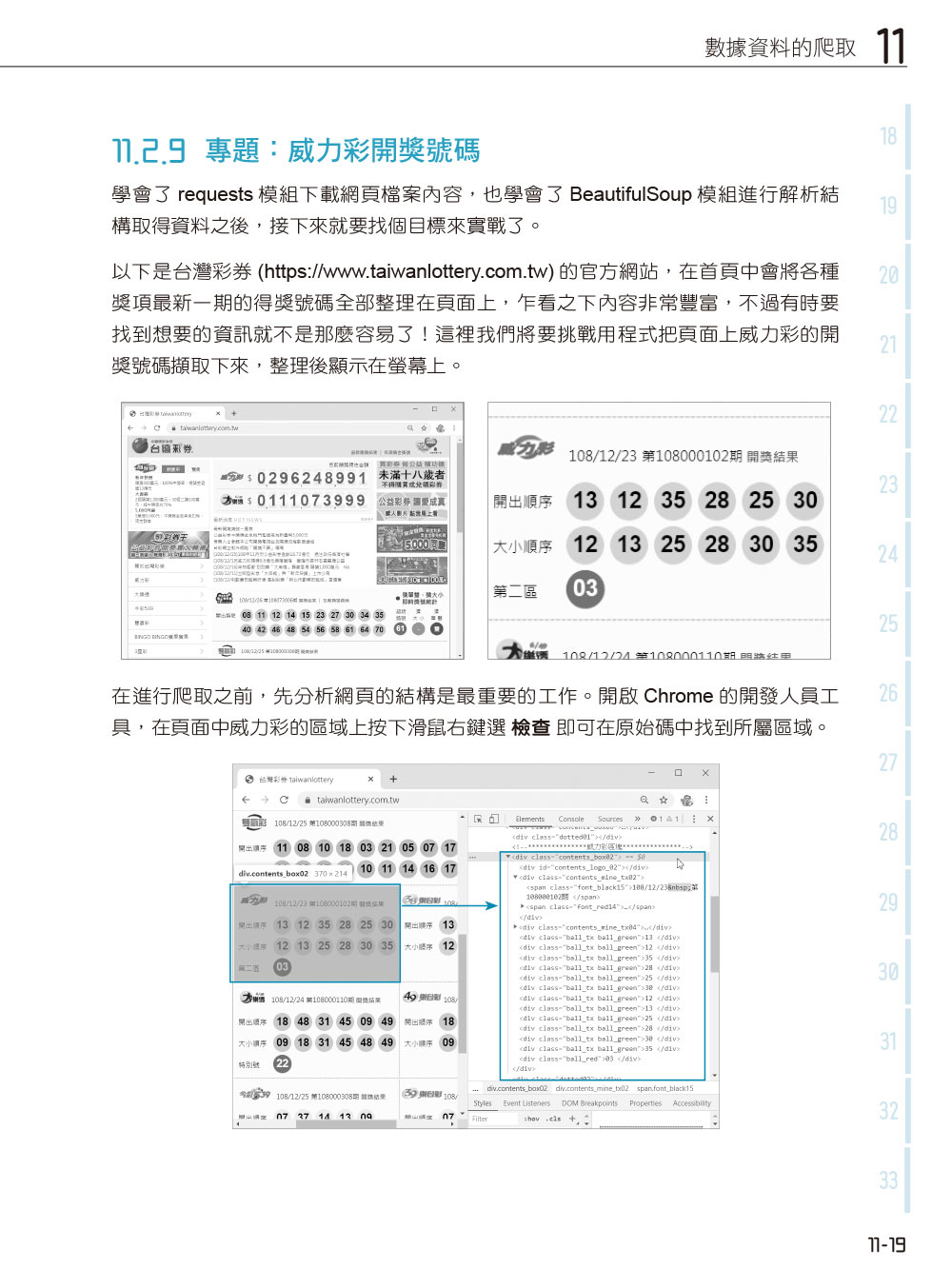 【基礎入門篇】01 建置Python開發環境1.1 建置Anaconda開發環境1.2 Spyder編輯器1.3 Jupyter Notebook編輯器02 變數、運算及判斷式2.1 變數與資料型別2.2 運算式2.3 判斷式03 迴圈、串列與元組3.1 迴圈與串列3.2 進階串列與元組04 字典的使用4.1 字典基本操作4.2 字典進階操作05 函式與模組5.1 自訂函式5.2 數值函式5.3 字串函式5.4 亂數模組【進階學習篇】06 檔案系統的使用6.1 檔案和目錄管理6.2 檔案的讀寫6.3 二進位檔案的讀寫07 物件導向程式開發7.1 類別與物件7.2 類別封裝7.3 類別繼承7.4 多型7.5 多重繼承7.6 類別應用7.7 建立Python專案7.8 打造自己的模組08 例外處理8.1 例外處理8.2 try…except常用例外錯誤表8.3 捕捉多個例外8.4 raise拋出例外8.5 Traceback記錄字串8.6 assert斷言09 圖形使用者介面設計9.1 Tkinter圖形使用者介面模組9.2 排版方式9.3 視窗區塊(Frame)10 正規表達式10.1 使用傳統程式設計方式搜尋10.2 使用正規表達式10.3 使用re模組建立隱含正規表達式物件10.4 更豐富的搜尋方式10.5 使用re.sub()取代字串10.6 正規表達式實務上的應用【資料科學篇】11 數據資料的爬取11.1 requests模組:讀取網站檔案11.2 BeautifulSoup模組:網頁解析11.3 Selenium模組:瀏覽器自動化操作12 數據資料的儲存與讀取12.1 csv資料的儲存與讀取12.2 Excel資料儲存與讀取档12.3 SQLite資料庫的操作12.4 MySQL資料庫的操作12.5 Google試算表的操作13 數據資料視覺化13.1 繪製折線圖:plot13.2 繪製長條圖:bar13.3 圓餅圖繪製:pie13.4 設定圖表區:figure13.5 在圖表區加入多張圖表:subplot、axes13.6 專題:台灣股市股價走勢圖14 Numpy與Pandas14.1 Numpy陣列建立14.2 Numpy陣列取值14.3 Numpy的運算功能14.4 Pandas Series14.5 Pandas DataFrame的建立14.6 DataFrame資料取值14.7 DataFrame資料操作14.8 Pandas資料存取14.9 Pandas模組:繪圖應用【網路應用篇】15 Flask網站開發15.1 基本Flask網站應用程式15.2 使用模板15.3 Template語言15.4 以GET及POST傳送資料16 Flask建立Web API及Heroku部署16.1 建立縣市天氣資料Web API16.2 部署Web API到Heroku16.3 Web API應用:縣市天氣應用程式17 Django網站開發17.1 Django是什麼?17.2 建立Django專案17.3 視圖(view)與URL17.4 視圖、模版與Template語言17.5 以GET及POST傳送資料18 Django資料庫連結與應用18.1 Django資料庫18.2 admin後台管理與ModelAdmin類別18.3 資料庫查詢18.4 資料庫管理19 Django專案實戰及Heruko部署19.1 Django新聞系統19.2 部署Django專案到Heroku20 LINE Bot申請設定及開發20.1 Line開發者帳號20.2 「鸚鵡」LINE Bot21 LINE Bot進階應用與互動功能21.1 圖文式LINE Bot21.2 LINE Bot基本互動功能22 LINE Bot專題實戰22.1 取得發票中獎號碼22.2 發票對獎LINE Bot【人工智慧篇】23 機器學習起點:多層感知器(MLP)23.1 認識多層感知器(MLP)23.2 Mnist資料集23.3 訓練Mnist手寫數字圖片辨識模型23.4 模型儲存與預測24 深度學習重點:CNN及RNN24.1 卷積神經網路(CNN)基本結構24.2 卷積神經網路實戰:Mnist手寫數字圖片辨識24.3 循環神經網路(RNN)基本結構24.4 循環神經網路實戰:股價預測25 演算法雲端利器:Algorithmia25.1 認識Algorithmia平台25.2 使用 Algorithmia演算法26 機器學習雲端平台:Azure26.1 電腦視覺資源26.2 臉部辨識資源26.3 文字語言翻譯資源27 自然語言處理(NLP)27.1 Jieba模組27.2 文字雲【IoT物聯網篇】28 MicroPython與ESP826628.1 認識MicroPython與ESP826628.2 NodeMCU和WEMOS D1 mini控制板簡介28.3 下載與燒錄MicroPython韌體28.4 使用Thonny操控MicroPython控制板28.5 使用麵包板連接LED電路28.6 LED閃爍電路實作29 MicroPython小專題實作29.1 三色Led燈29.2 按鈕開關29.3 PWM電路29.4 類比輸入29.5 蜂鳴器30 感測器應用:溫溼度與超音波感測器30.1 Timer計時器30.2 DHT11溫溼度感測器30.3 超音波感測器31 顯示裝置:LCD液晶顯示器31.1 認識I2C31.2 LCD顯示器32 Wi-Fi無線網路32.1 Wi-Fi無線網路32.2 設定開機自動連線32.3 讀取網站32.4 建立網路通訊程式32.5 連結網站伺服器32.6 以HTTPS連結網站伺服器33 物聯網應用33.1 網站伺服器33.2 傳送HTML網頁和圖片檔33.3 遠端控制33.4 從外部網路控制33.5 ThingSpeak的物聯網應用