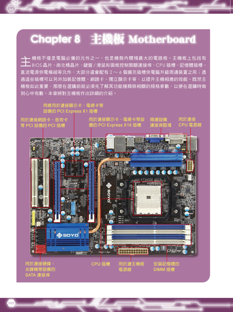 Part I|透視電腦配備Chapter 1 螢幕1-1 認識螢幕1-2 確認個人需求1-3 螢幕採購指南Chapter 2 鍵盤與滑鼠2-1 認識鍵盤與滑鼠 2-2 了解青/紅/黑/茶軸機械鍵盤2-3 確認個人需求2-4 鍵盤與滑鼠採購指南Chapter 3 機殼與電源供應器3-1 認識機殼與電源供應器3-2 認識個人需求3-3 機殼與電源供應器採購指南Chapter 4 光碟機與燒錄機4-1 認識DVD與藍光光碟機/燒錄機 4-2 燒錄片種類及選購4-3 確認個人需求4-4 藍光光碟機/燒錄機採購指南Chapter 5 喇叭、麥克風、視訊裝置5-1 了解喇叭的聲道區別與種類 5-2 認識麥克風5-3 了解視訊裝置的種類及畫素5-4 確認個人需求5-5 喇叭、麥克風、視訊裝置採購指南Chapter 6 掃描器、印表機、多功能事務機6-1 認識掃描器6-2 認識印表機6-3 認識多功能事務機6-4 主流印表機介紹6-5 確認個人需求6-6 掃描器、印表機、多功能事務機採購指南Part II|透視電腦主機裡的各種零組件Chapter 7 中央處理器 CPU7-1 認識CPU7-2 CPU的規格與技術指標7-3 CPU選購指南7-4 漫談CPU7-5 CPU與主機板搭配的注意事項Chapter 8 主機板 Motherboard8-1 認識主機板8-2 主機板採購指南Chapter 9 記憶體 RAM9-1 認識記憶體9-2 記憶體採購指南Chapter 10 硬碟機 Hard Disk10-1 認識硬碟10-2 主流硬碟介紹10-3 硬碟採購指南Chapter 11 顯示卡Display/Graphic Card11-1 認識顯示卡11-2 多顯示卡注意事項11-3 顯示卡採購指南Chapter 12 音效卡 Sound Card12-1 認識音效卡12-2 音效卡採購指南Chapter 13 無線網路設備13-1 認識網路設備 13-2 無線網路卡/路由器採購指南 Part III|開始DIY讓電腦動起來Chapter 14 DIY準備階段14-1 初識電腦DIY流程 14-2 組裝工具準備Chapter 15 安裝CPU及散熱風扇15-1 安裝Intel CPU與散熱風扇 15-2 安裝AMD CPU與散熱風扇Chapter 16 安裝記憶體16-1 安裝記憶體注意事項 16-2 安裝記憶體Chapter 17 拆除機殼17-1 拆除機殼注意事項17-2 拆除機殼流程Chapter 18 安裝主機板18-1 安裝主機板前確認事項18-2 安裝主機板18-3 安裝主機板注意事項Chapter 19 安裝光碟機/燒錄機19-1 安裝光碟機/燒錄機注意事項19-2 光碟機/燒錄機的安裝流程Chapter 20 安裝硬碟20-1 安裝硬碟注意事項20-2 開始安裝硬碟機20-3 安裝固態硬碟Chapter 21 安裝電源供應器21-1 安裝電源供應器注意事項21-2 安裝電源供應器Chapter 22 接上機殼訊號線及主機板電源線22-1 安裝機殼訊號線22-2 安裝主機板電源線Chapter 23 安裝獨立顯示卡23-1 安裝獨立顯示卡注意事項23-2 安裝PCI-E顯示卡Chapter 24 裝回機殼並安裝鍵盤和滑鼠24-1 安裝機殼側板注意事項24-2 安裝機殼側板24-3 USB鍵盤與滑鼠的安裝流程Chapter 25 連接螢幕訊號線到主機25-1 安裝螢幕訊號線的注意事項25-2 安裝螢幕訊號線25-3 連接機殼電源線與螢幕電源線 Chapter 26 安裝其他周邊裝置26-1 連接喇叭、麥克風、視訊攝影機26-2 連接其他周邊裝置Chapter 27 硬體初始化設定及簡易故障排除27-1 開機測試27-2 電腦檢測與故障排除Part IV|系統安裝、更新與防護Chapter 28 安裝作業系統28-1 安裝Windows 728-2 安裝Windows 828-3 更快的安裝系統Chapter 29 安裝驅動程式29-1 何謂驅動程式?29-2 安裝驅動程式Chapter 30 備份純淨的系統30-1 系統備份與還原30-2 製作系統還原點30-3 製作系統修復光碟30-4 用修復光碟還原修復系統Chapter 31 連接網路、更新系統31-1 準備網路線31-2 上網設定31-3 系統軟體更新Chapter 32 安裝防毒軟體32-1 認識電腦病毒、駭客、後門程式32-2 主流防毒軟體概述32-3 取得免費防毒軟體32-4 安裝與設定防毒軟體Part V|硬體檢測維護自己來Chapter 33 檢測與維護硬體33-1 掌握硬體資訊33-2 硬體維護33-3 檢測電腦元件33-4 檢測電腦穩定性-燒機Chapter 34 加速與維護作業系統34-1 七大技巧加速Windows 734-2 完善系統防護體系34-3 維護磁碟34-4 移除不需要的程式/軟體Chapter 35 DIY大補丸35-1 DIY採購技巧35-2 2012主機配置參考35-3 電腦周邊裝置概覽35-4 裝機必備軟體35-5 免費下載常用軟體與安裝Chapter 36 常見系統/軟體故障排解36-1 Windows 7無法啟動36-2 系統經常出現藍色當機畫面36-3 防毒軟體突然失去作用,也無法存取其官方網站36-4 發送或接收郵件時出現「0x800ccc0D、0x800ccc0E、0x800CCC0F」的錯誤訊息36-5 舊版軟體無法在Windows 7中安裝或執行