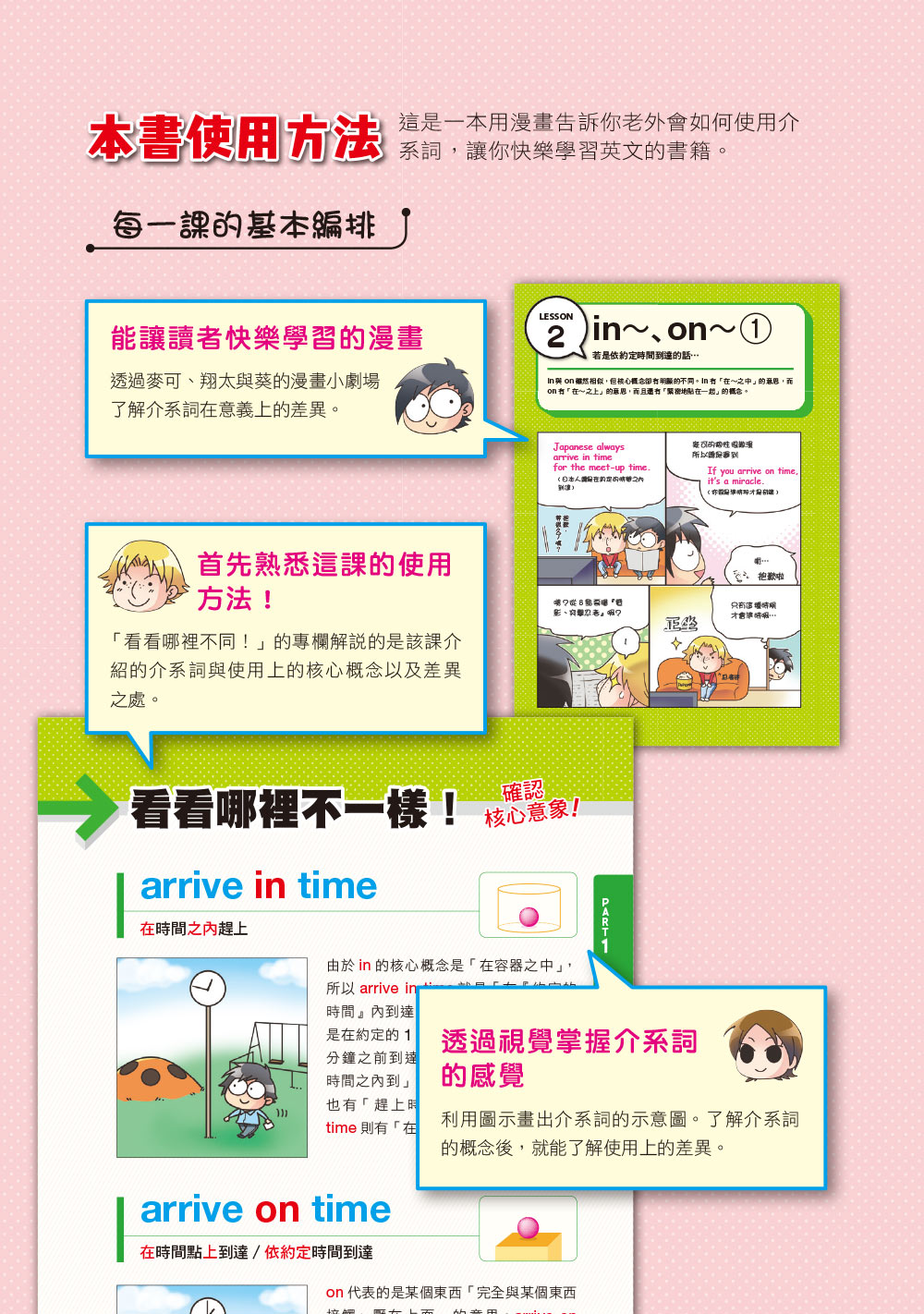 介系詞的視覺化圖解本書使用方法PART 1 代表「時間」的介系詞 LESSON 1 at~、in~ 1 個小時結束它! LESSON 2 in~、on~ 若是依約定時間到達的話… LESSON 3 in~、on~ 早上就出發吧! LESSON 4 in~、within~ 在 1 個小時之內出發吧! LESSON 5 until~、by~ 一直吃到 5 點嗎? LESSON 6 from~、since~ 從 2 點開始一直做到現在。 LESSON 7 from~ to⋯、from~through⋯ 從星期一到星期五都要打工。 LESSON 8 during~、for~ 講了 4 個小時之久的電話。 LESSON 9 about~、around~ 差不多三點可以出發! 透過介系詞表現的日常詞彙 ①PART 2 代表「場所」的介系詞 LESSON 1 at~、in~ 約在車站見面囉! LESSON 2 on~、in~ 把麥可丟在火車裡! LESSON 3 on~、in~ 趴在地上,大打一架! LESSON 4 in~、into~ 跳進游泳池! LESSON 5 on~、over~ 頭上的頭髮居然…! LESSON 6 to~、for~ 去了院子那邊。 LESSON 7 away~、off~ 快從公車離開! LESSON 8 under~、below~ 在桌子底下…。 LESSON 9 across~、through~ 蛇穿過馬路。 透過介系詞表現的日常詞彙 ②PART 3 代表「動作」的介系詞(基本篇) LESSON 1 be in~、be into~ 超樂在其中的! LESSON 2 do with~、do without~ 這樣不合適啦! LESSON 3 come from~、come under~ 我是來自大阪的山口。 LESSON 4 go well with~、go against~ 哪邊都反對! LESSON 5 speak against~、speak for~ 是要批評我嗎? LESSON 6 call for~、call to~ 聽到某人求助的聲音…。 LESSON 7 fall in~、fall on~ 是墜入愛河了啦…。 LESSON 8 look to~、look beyond~ 將眼光放在未來。 LESSON 9 stay in~、stay with~ 在同事家留宿。 LESSON 10 keep to~、keep at~ 持之以恆地練習的話…。 LESSON 11 break with~、break through~ 聽說你跟 Ben 絕交? LESSON 12 get into~、get at~ 察覺實情。 LESSON 13 ask after~、ask for~ 他的狀況如何呢? LESSON 14 answer to~、answer for~ 給我好好說明! LESSON 15 agree to~、agree with~ 我贊成。 透過介系詞表現的日常詞彙 ③PART 4 代表「動作」的介系詞(應用篇) LESSON 1 live in~、live under~ 住在加拿大! LESSON 2 talk at~、talk~into⋯ 自顧自地說話是不行的。 LESSON 3 be made from~、be made of~ 巧克力是從可可豆製作的。 LESSON 4 make at~、make good as~ 怪物襲擊他! LESSON 5 turn on~、turn off~ 關掉電燈。 LESSON 6 work on~、work into~ 讓我們一起製作野餐的計劃表。 LESSON 7 run for~、run against~ 成為總幹事候選人! LESSON 8 stand at~、stand for~ 就是「我去買冰淇淋回來」的意思。 LESSON 9 fight with~、fight against~ 與動物們戰鬥。 LESSON 10 open into~、be open to~ 會通往哪裡呢? LESSON 11 hold by~、hold to~ 請遵守自己決定的事。 LESSON 12 leave~to⋯、leave it at~ 這件事就交給你囉! LESSON 13 put~before⋯、put~behind⋯ 忘了那件事吧! 透過介系詞表現的商場詞彙可根據介系詞查詢的索引可根據動詞查詢的索引