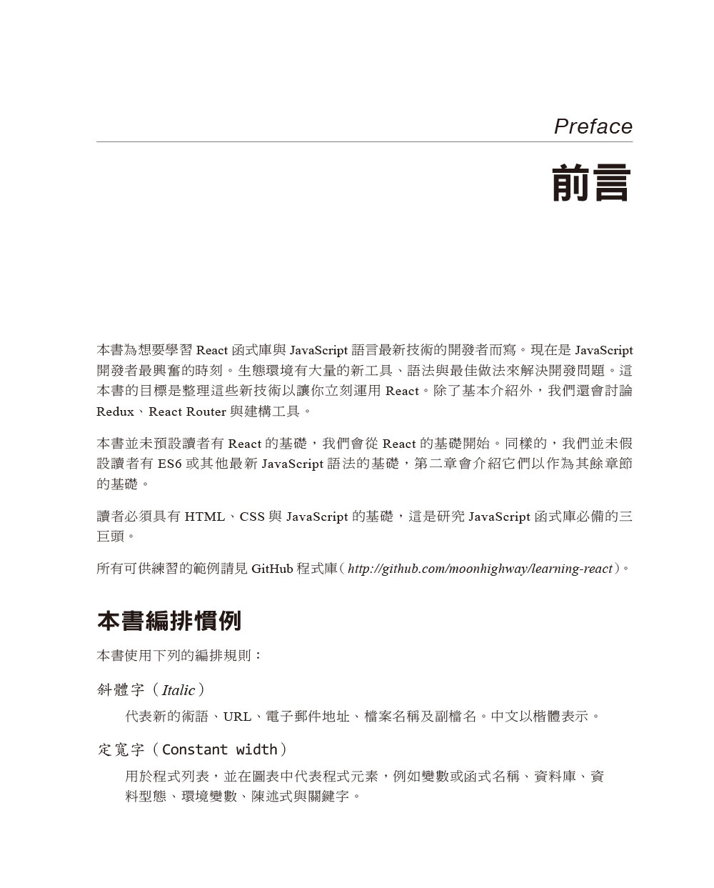 前言第一章 歡迎來到React第二章 JavaScript 新技術第三章 JavaScript 的函式性程式設計第四章 純React第五章 React 與JSX第六章 屬性、狀態與元件樹第七章 強化元件第八章 Redux第九章 React Redux第十章 測試第十一章 React Router第十二章 React 與伺服器索引