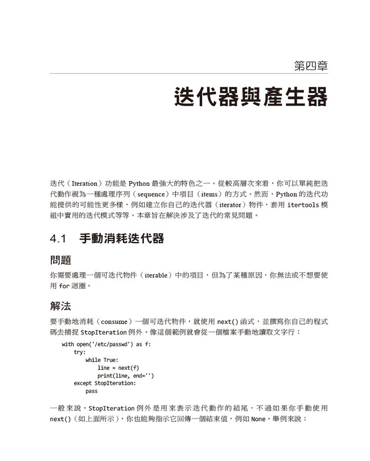 第一章 資料結構與演算法第二章 字串與文字第三章 數字、日期與時間第四章 迭代器與產生器第五章 檔案與I/O第六章 資料編碼與處理第七章 函式第八章 類別與物件第九章 Metaprogramming第十章 模組與套件第十一章 網路與Web 程式設計第十二章 共時性(Concurrency)第十三章 撰寫工具指令稿與系統管理第十四章 測試、除錯與例外第十五章 C 擴充功能(C Extensions)附錄A 延伸閱讀索引