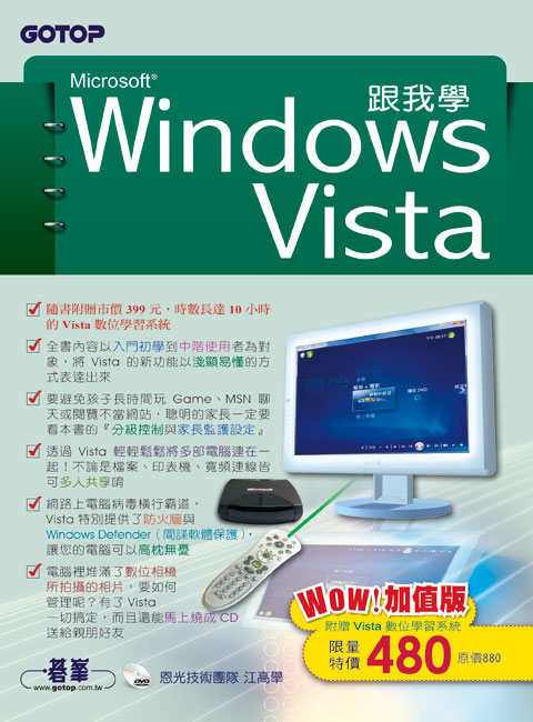 *隨書附贈市價399元,時數長達10小時的Vista數位學習系統*全書內容以入門初學到中階使用者為對象,將Windows Vista的新功能以淺顯易懂的方式表達出來。*要避免孩子長時間玩Game、MSN聊天或閱覽不當網站,聰明的家長必須閱讀本書的『分級控制與家長監護設定』內容。*透過Windows Vista的功能,輕輕鬆鬆就可以把這些電腦連在一起了,不論是檔案、印表機、寬頻連線大家都可以同時使用。*網路上電腦病毒橫行肆虐,Windows Vista特別提供了防火牆與Windows Defender(間諜軟體保護),讓您的電腦可以高枕無憂!*您的電腦中是否已經堆滿了數位相機所拍攝的相片,要如何管理呢?有了Windows Vista一切搞定,而且還能馬上燒錄到CD上分送給親朋好友。