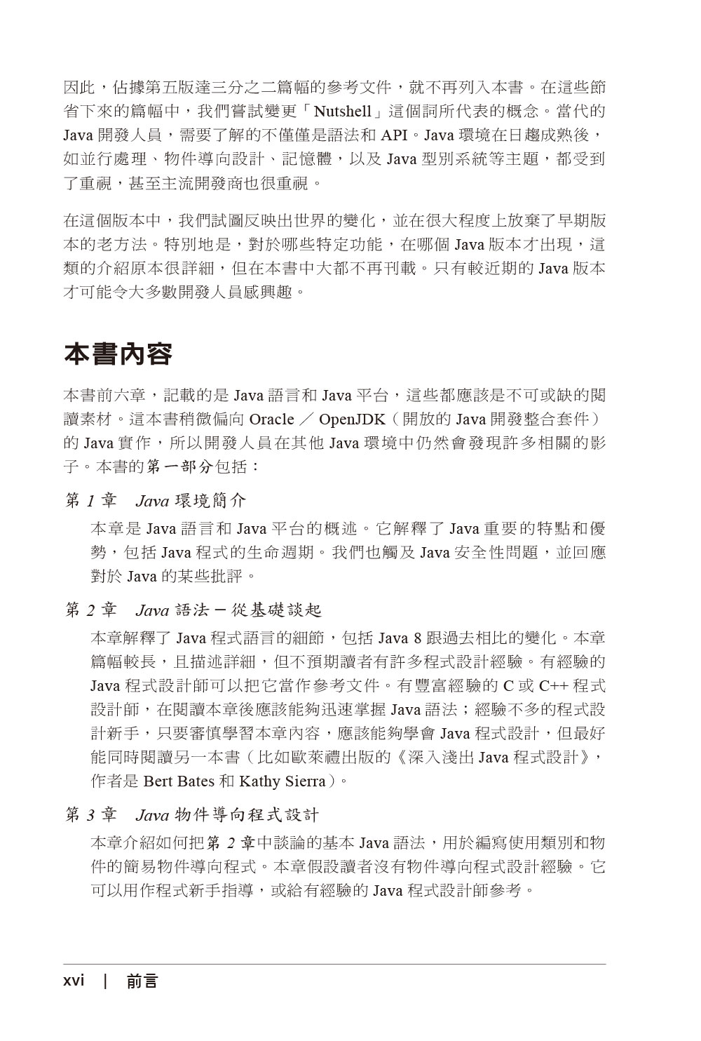 「在熱門技術討論區和 javadoc'd 參考資料中,這本最新版本書籍仍然是最簡單明確的途徑,讓你很快得到所需要的答案。」 -Kevlin Henney顧問、作家、演講者及《程式設計人應該知道的97件事》的書籍主編 本書能幫助有經驗的 Java 程式設計師學習到 Java 7 和 Java 8 最豐富的知識,同時也是開發新手的學習途徑。提供大量案例為讀者示範如何運用當代 Java API 的優點,同時體驗最佳的開發實務。此次新版內容全面更新,第一部分提供 Java 程式語言簡介及介紹 Java 平台核心運行。第二部分為核心概念和 API 參考資料,展示如何在 Java 環境中執行實際的程式編寫工作。‧對語言細節瞭如指掌,包括 Java 8 的改變 ‧使用基本的 Java 語法及學習物件導向程式設計 ‧探索泛型、列舉、註釋及 lambda 運算式 ‧了解物件導向設計中用到的基本技術 ‧詳細檢視平行處理和記憶體之間的運作互動關係 ‧操作 Java 集合及處理常見的資料格式 ‧探索 Java 最新的 I/O API,包括非同步通道 ‧在 Java 虛擬機器上使用 Nashorn 執行 JavaScript ‧熟悉 OpenJDK 的開發工具
