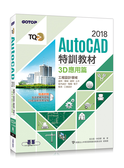 電腦只是工具,人腦才是主導。資訊化社會必須全民使用電腦,各行各業電腦化不但需要優秀的專業人員開發一流電腦軟、硬體,更要熟悉電腦技能的人來操作。在工商業領域中,圖是一種世界性的語言,透過電腦輔助製圖(Computer Aided Design)的運用,更能有效率地處理並傳播各式各樣複雜圖面以滿足各個領域的需求。身處產業競爭的時代,只有利用有效工具快速提高生產力的企業經營者,才能提升競爭力,開創新的經營局面。電腦技能基金會為因應此趨勢的來臨,辦理各項電腦技能測驗、競賽等相關活動,並藉著相關書籍的出版,提供有心想學好各項電腦技能的朋友,一個合適的管道。AutoCAD 自推出以來,廣受各界的好評,這次AutoCAD 2018的推出可說是Autodesk公司繼AutoCAD 2017之後,又一次劃時代之作,不只它的作業環境與操作界面更為友善與便捷,更包含了許多針對全球AutoCAD 使用者的需求建議所加入的新指令及強化功能。我們誠摯地感謝吳永進和林美櫻二位作者,以其多年的教學與實務經驗,並在電腦技能基金會的策劃下,為讀者編寫這本「TQC+ AutoCAD 2018特訓教材-3D應用篇」,相信這本書可以成為CAD學習者的最佳選擇,誠如作者所說:「用心學習AutoCAD 2018期許新手快速成為CAD專業工程師,期許AutoCAD 2009~2016、2017老手如虎添翼,功力更上一層樓。」若是讀者在經過一段時間的學習之後,想了解自己對本書之觀念及繪圖技巧的掌握以及個人電腦輔助製圖能力之提升狀況,可以繼續使用本會所出版之「TQC+ 電腦輔助立體製圖認證指南」,並歡迎參加本會所舉辦的「TQC+ 工程設計領域 電腦輔助立體製圖認證」,不但能肯定自己,使自己更有信心,亦能幫助自己在眾多的競爭者當中脫穎而出。 財團法人中華民國電腦技能基金會董事長 侯清雄 秘書長 杜全昌
