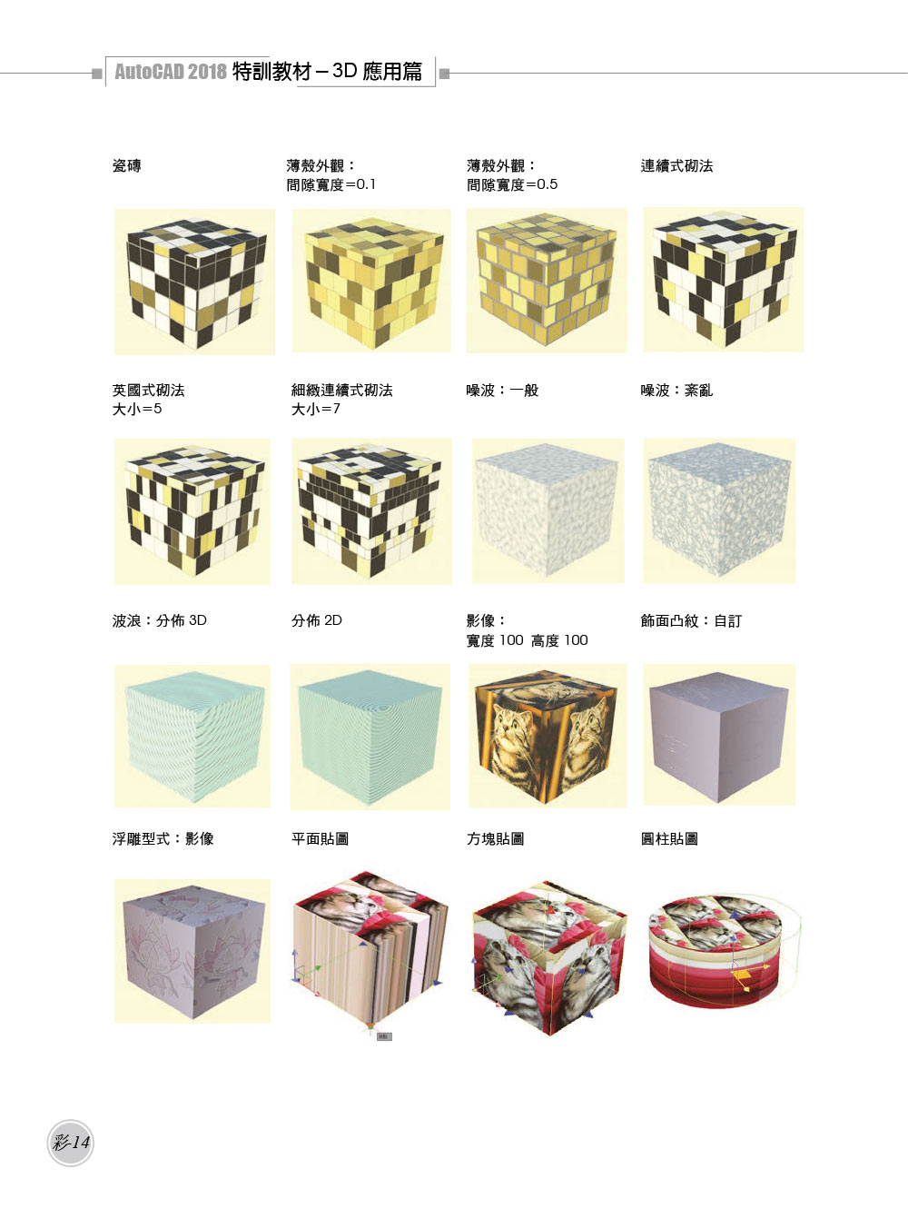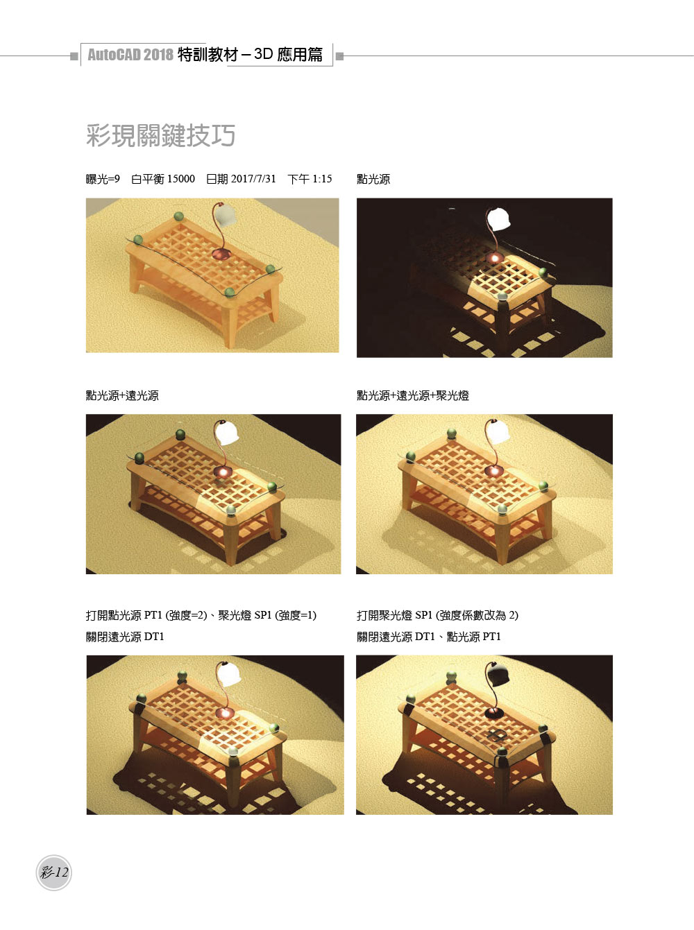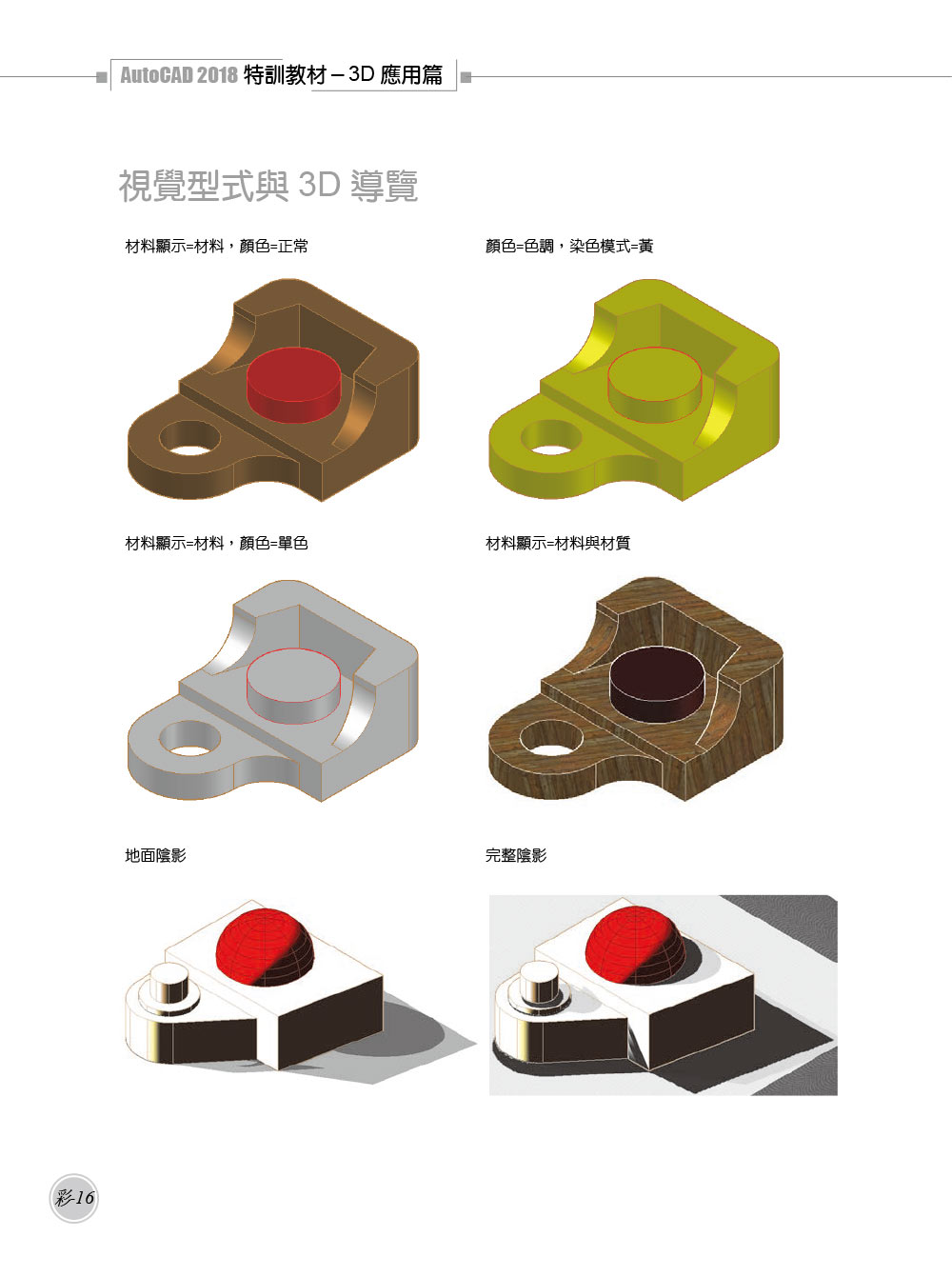 第一篇 AutoCAD 2018 3D特訓精華第一章 踏出3D關鍵的第一步第二章 快速掌握基本3D與觀測顯示與查詢第三章 輕鬆掌握UCS座標系統第四章 3D實體塑型第五章 3D重要編修工具第六章 3D新網面塑型第七章 3D曲面塑型第八章 輕鬆掌握3D配置與出圖第九章 三視圖立體圖互轉與基準、剖面與詳圖第十章 輕鬆掌握3D透視、相機與動畫第十一章 掌握3D尺寸標註技巧第十二章 輕鬆掌握彩現關鍵技巧第十三章 輕鬆掌握材料與光源關鍵技巧第十四章 影像控制與活用技巧第十五章 輕鬆掌握視覺型式與3D導覽第二篇 精選3D基礎教學第三篇 精選3D實力挑戰第四篇 精選3D生活用品第五篇 精選AutoCAD技能檢定試題附 錄 TQC+ 專業設計人才認證簡章